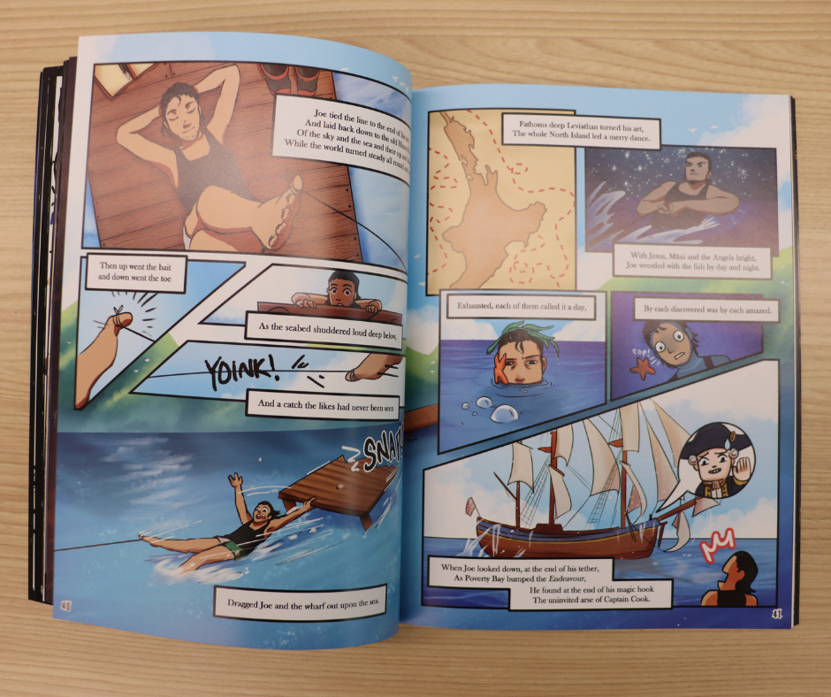 Manawatū Community Hub Libraries are proud to feature this book and to highlight Deanna Gunn, MCHL Makerspace Specialist, who illustrated pages 36–51 (Episode the Second). Remarkably, Glenn had previously approached Deanna for other projects during high school, this project began in 2021, two years after she completed her degree.Making her involvement an exceptional example of youth creativity recognised on a national stage. Today, she continues to illustrate professionally, holding a Bachelor of Creative Media from UCOL with a focus on illustration.