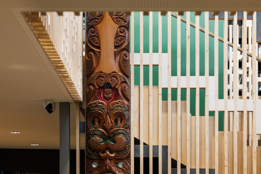 Visitors can explore the Cultural Narrative of Te Āhuru Mōwai in English and te reo Māori. The design tells a story: the central area reflects Te Pō (darkness and potential), while light filled meeting spaces embody Te Ao Mārama (the world of light and knowledge). Patterns, pou whakairo, and the Whāriki inspired carpet guide visitors on a journey of learning and engagement.